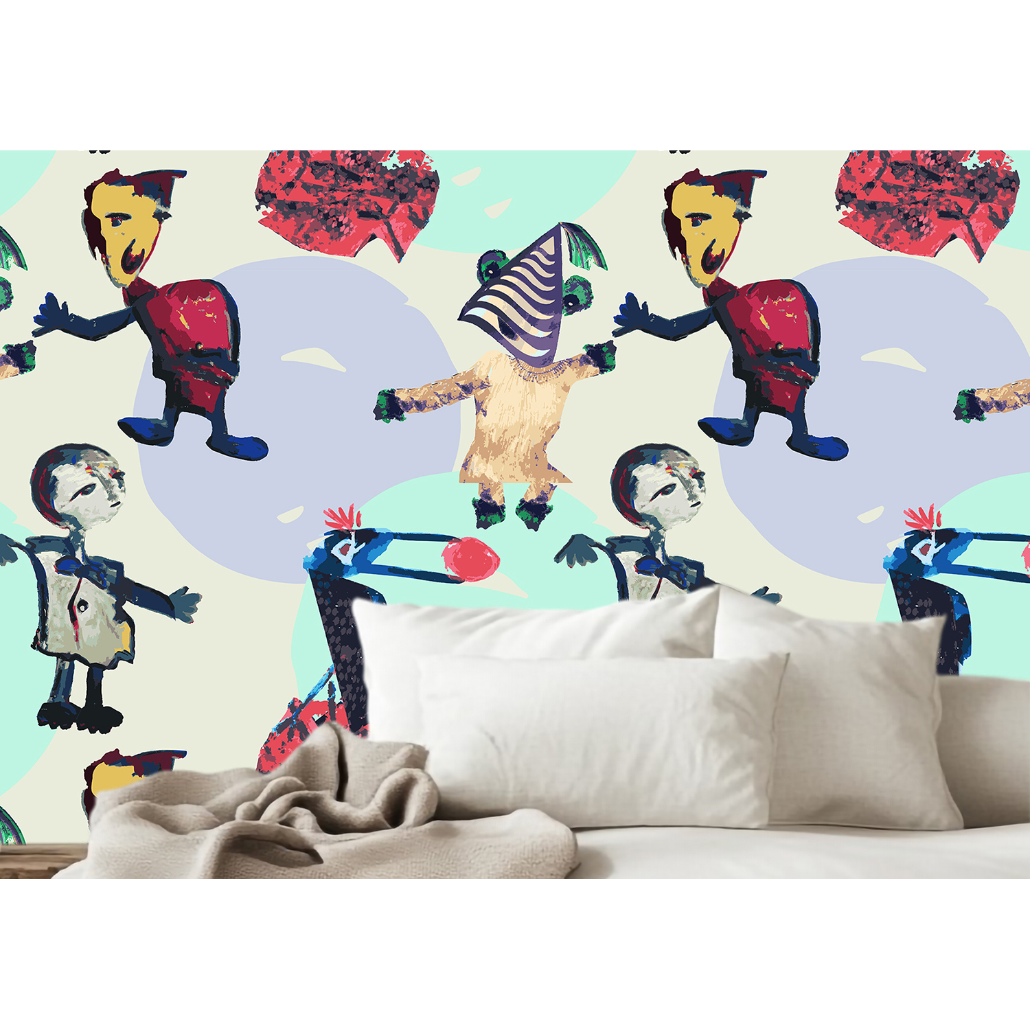 Modernes Figurenmuster mit Farbigkeit Rot, Blau, Gelb, aber auch Weiß, Lindgrün und Rosa – stilvoll und lebendig, ideal für verspielte Textilien.