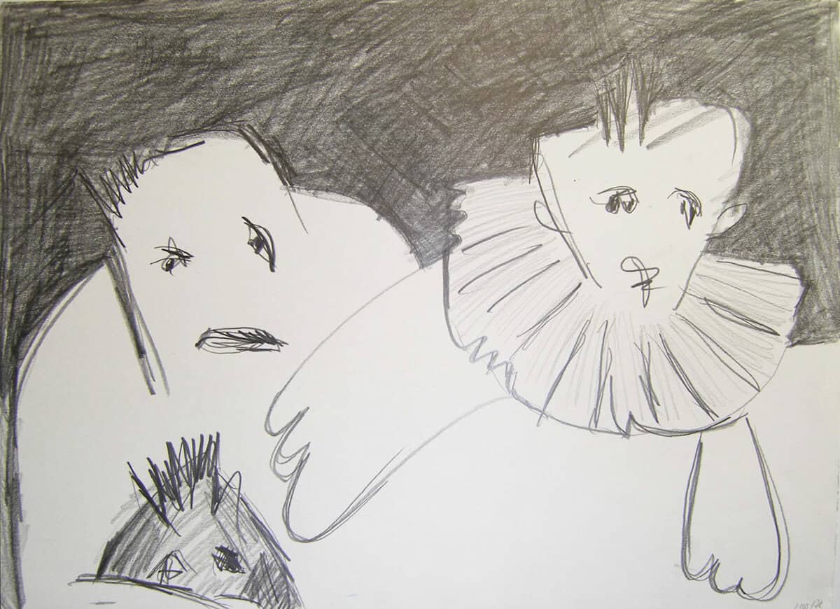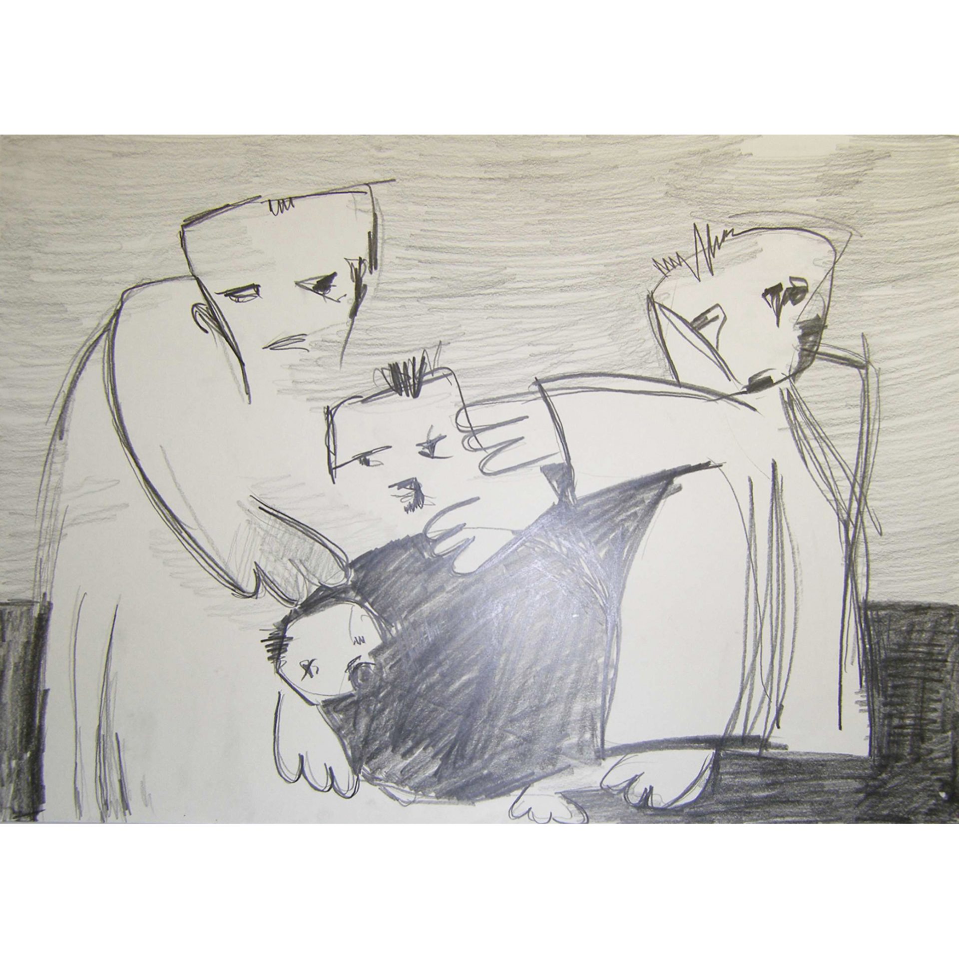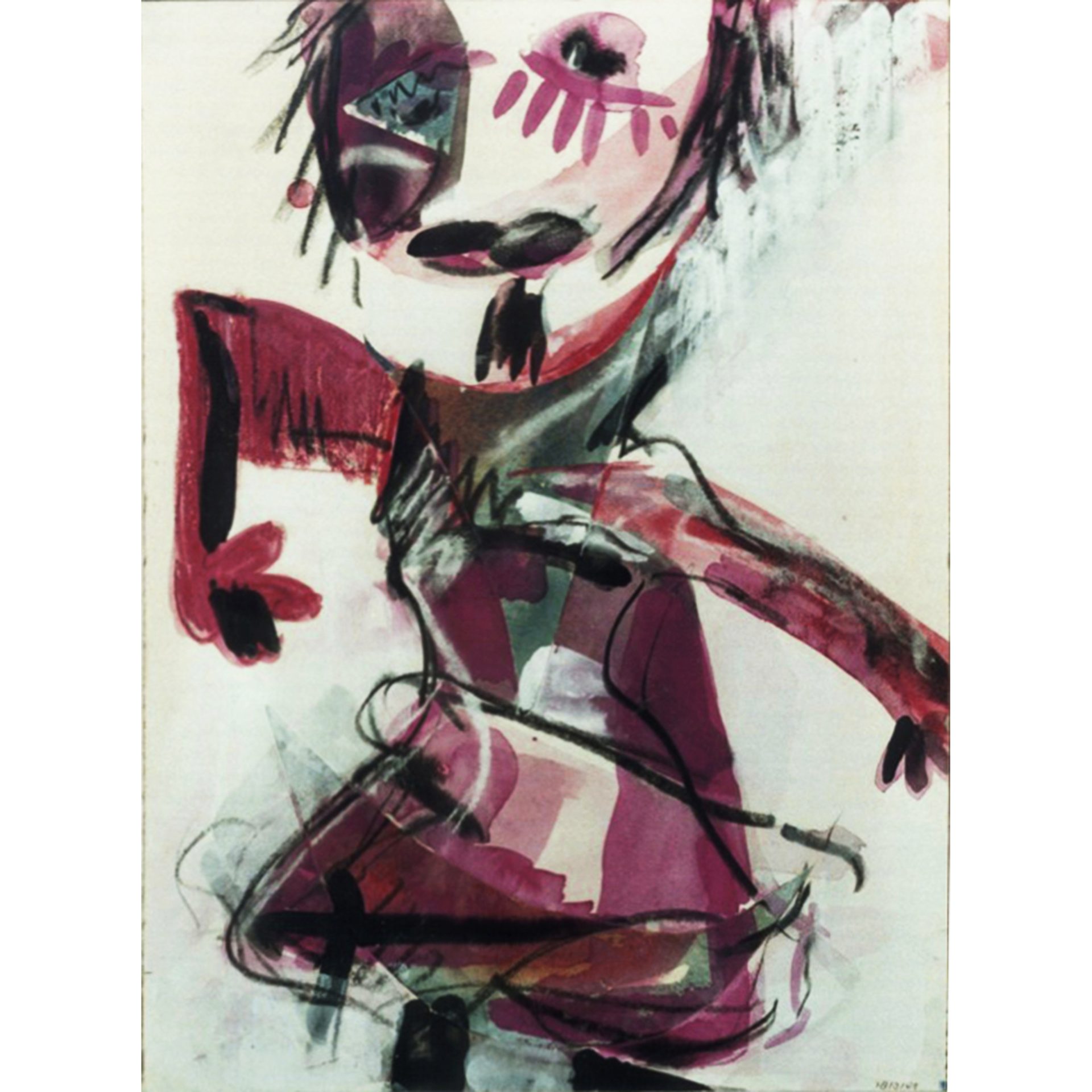 In dieser Sammlung geht es um Gesten, Materialität und das Flüchtige. Frau mit Vase (Acryl auf Karton) zeigt Linien und Farbflächen, die zwischen Nähe und Distanz oszillieren.
