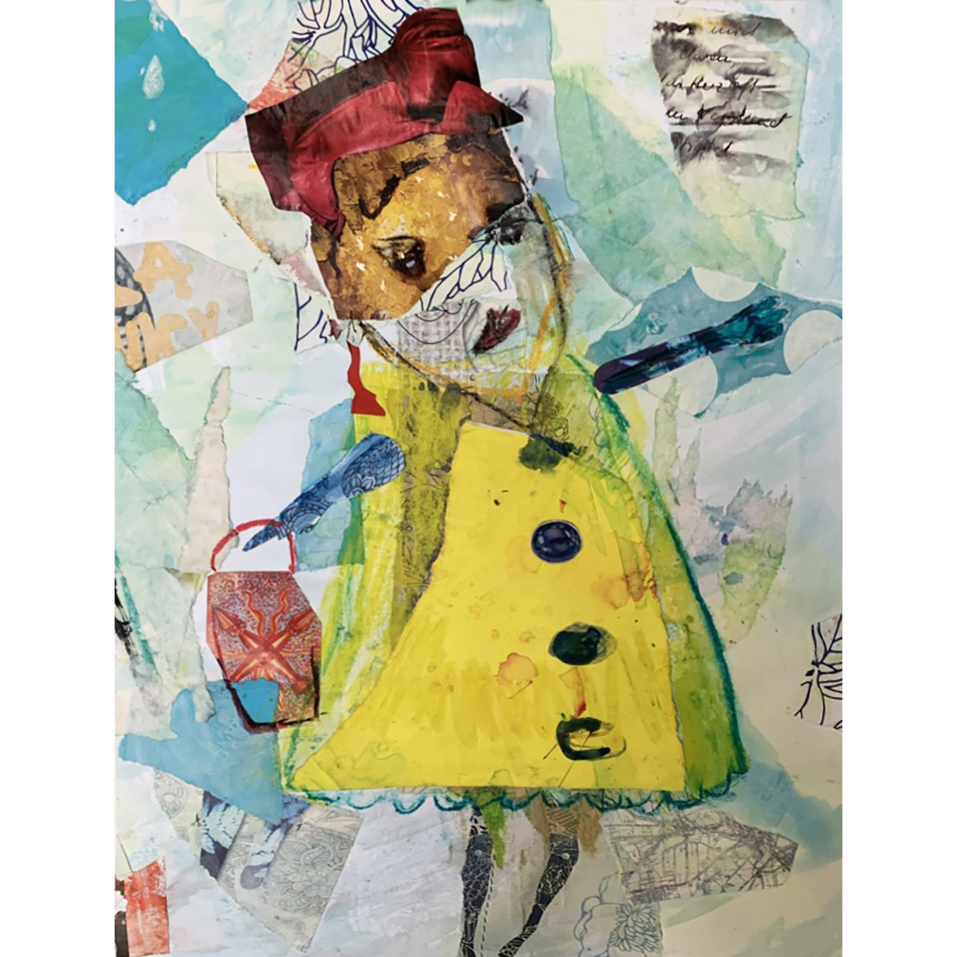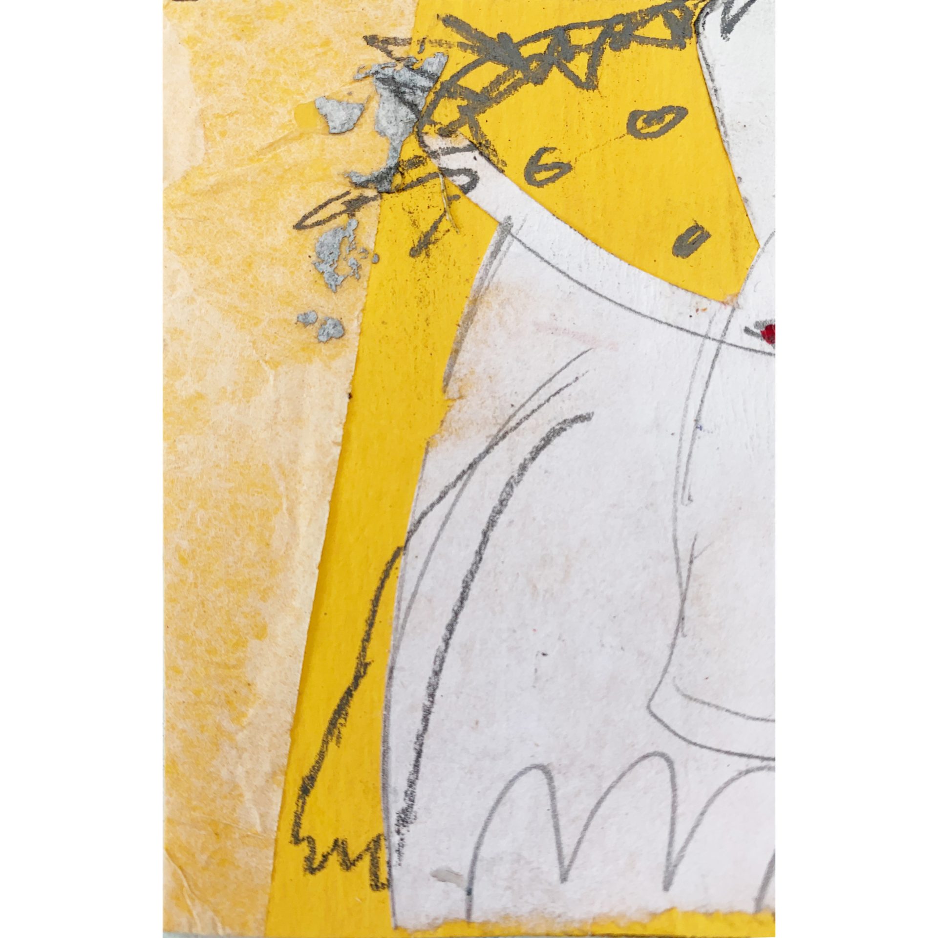 Zart gezeichnete Gestalt im gelben Habit: zwischen Andeutung und Erinnerung. Papierfragmente halten den Moment wie eine leise Ikone fest.