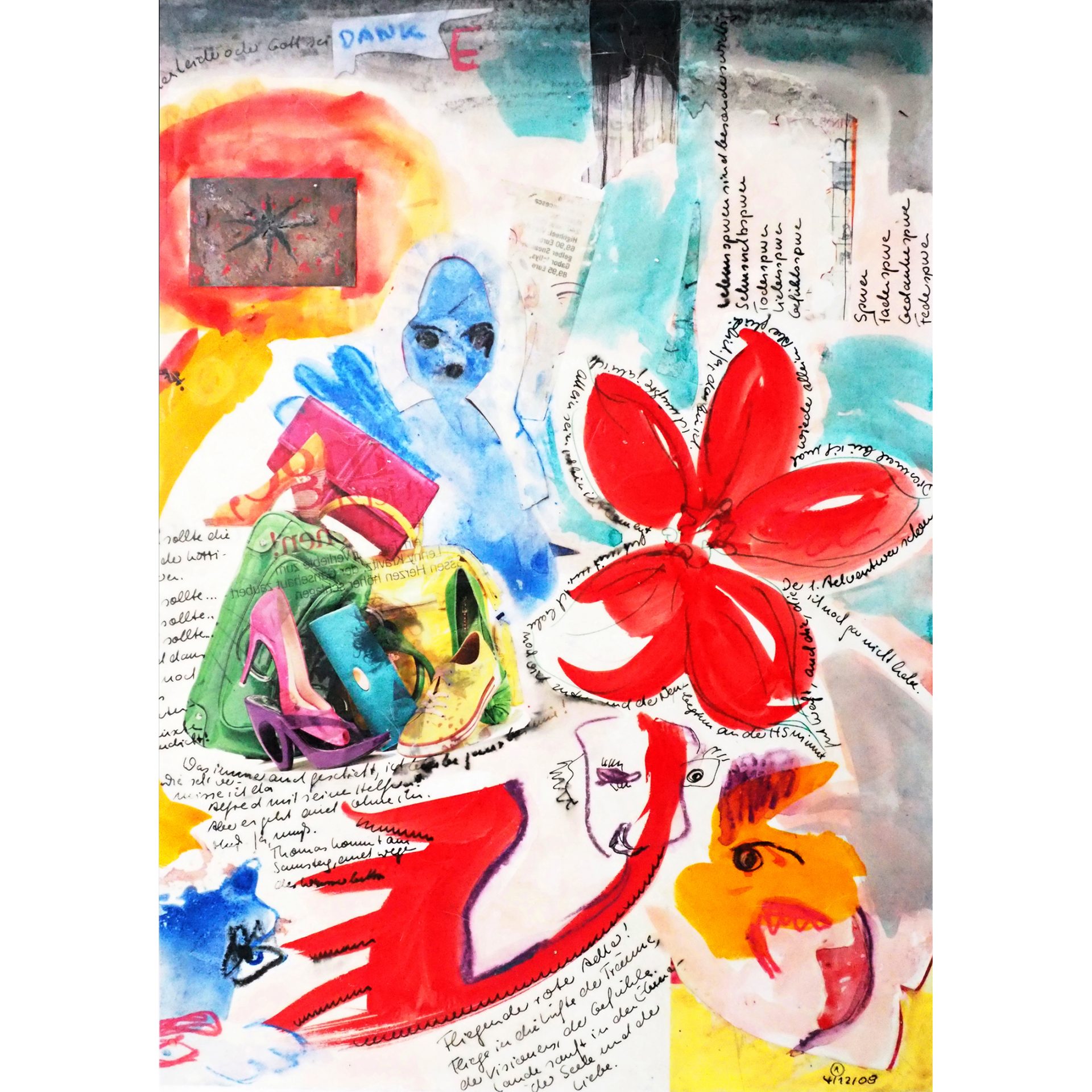 Notizen, Zeichen, eine rote Blüte – alles in Bewegung. Lebensfreude als Collage der Überfülle.